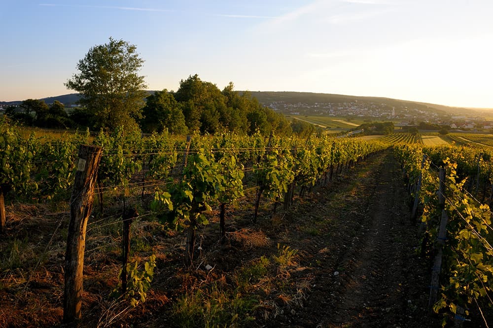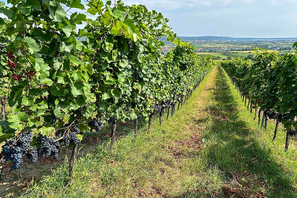 Kilátás az egyik szőlőültetvényre, a háttérben az eisenstadti kórház